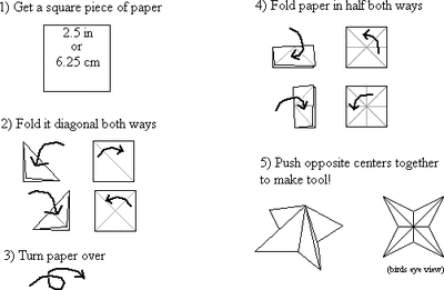Method: Now, stab the pin into the eraser so one point is facing up. Next, fold the paper or tinfoil in half vertically, facing toward us, fold the top down, then unfold. After that, fold again but this time horizontally. Unfold, now our paper or tinfoil will look like it is divided into 4 parts. Flip the paper over then diagonally fold in half, making a triangle. As for next repeat for the other side. Now our paper or tinfoil will look like it is divided into 8 parts. It will look like sort of a star or shuriken. Now we have to balance the paper on the top of pin, so it will spin. Next, we have to clear our mind and focus our attention on the paper. We have to try to morph our energy with the cells in it. We have to let it connect with us. Then once we have a feeling we are it and it is us, we have to try to move it like moving an arm.
